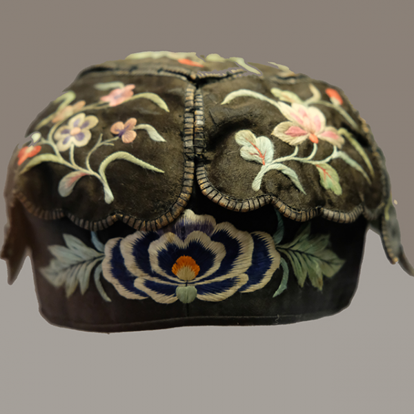 妇女儿童博物馆:黑缎地平绣花卉纹六瓣碗帽