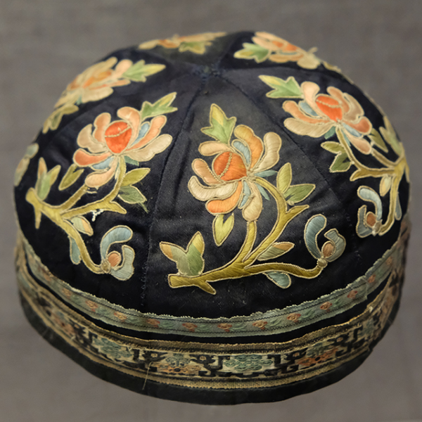妇女儿童博物馆:黑缎地平绣花卉碗帽
