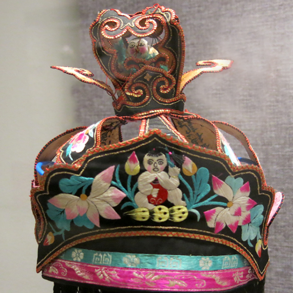 妇女儿童博物馆:黑缎地堆锦平绣花卉纹莲花童子冠