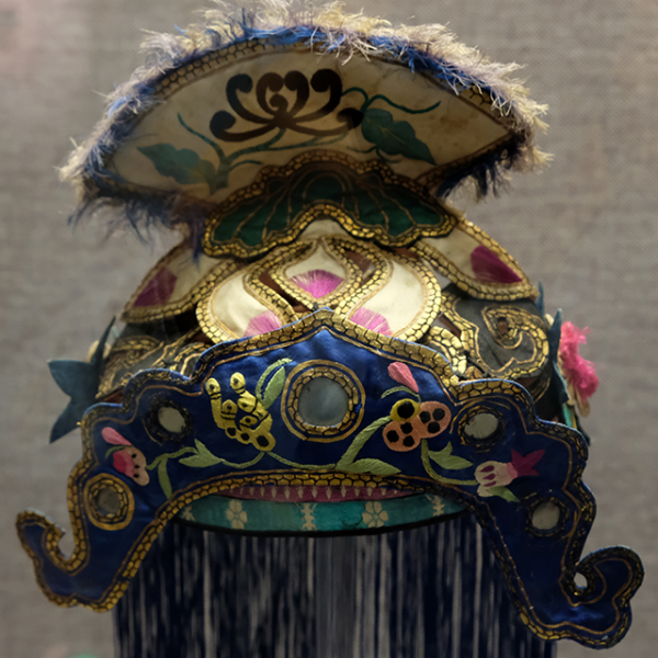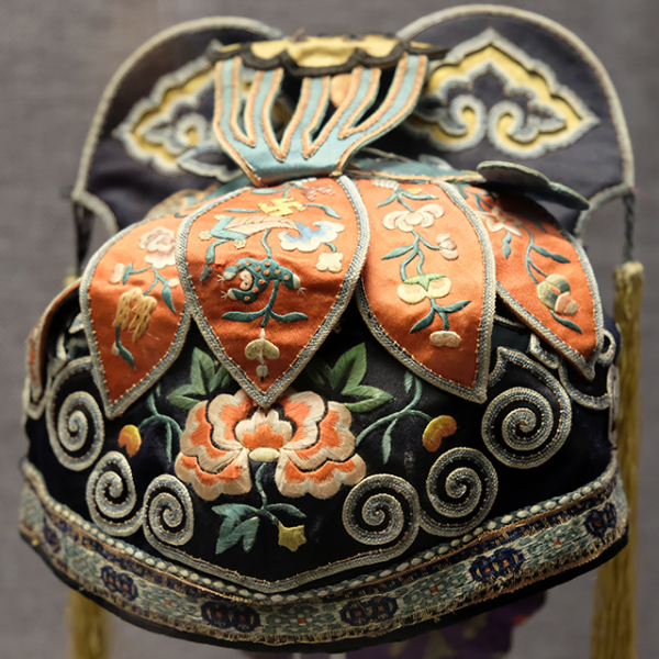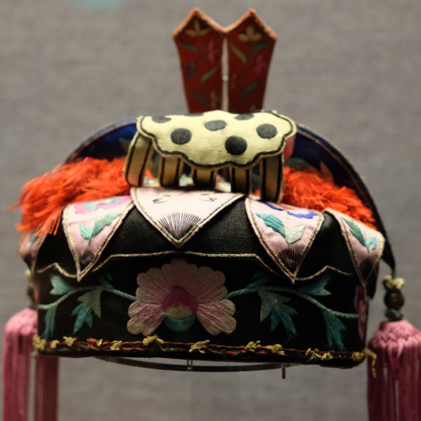 妇女儿童博物馆:黑缎地平绣花卉云纹莲顶帽