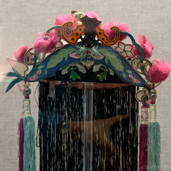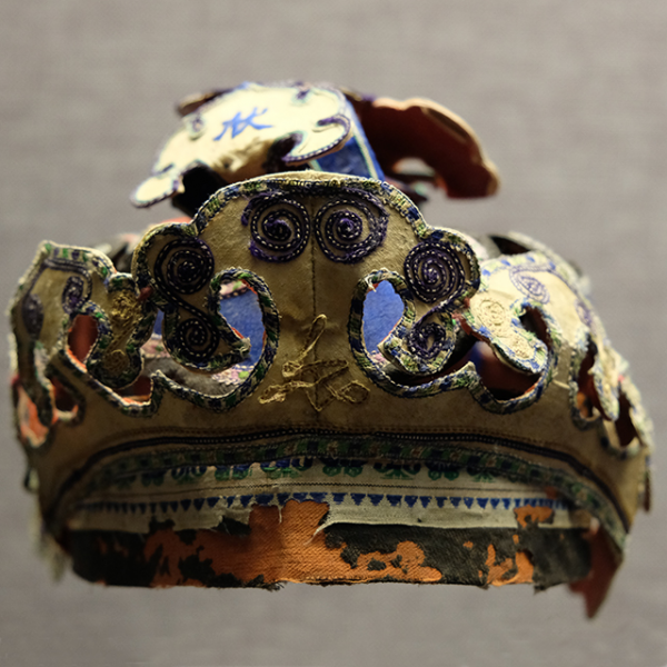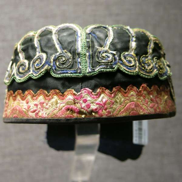 妇女儿童博物馆:黑布地钉线绣蝙蝠纹连尾凉帽