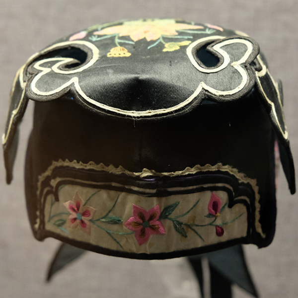 黑缎地剪纸绣花卉鱼纹翻耳虎头棉风帽