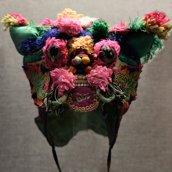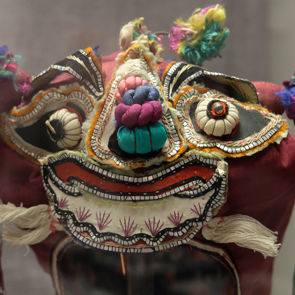 妇女儿童博物馆:粉缎地布贴钉线绣狮子风帽