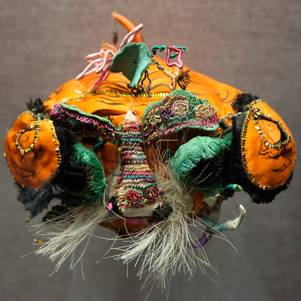 橙黄缎地墨绘五毒虎身纹布贴包梗绣虎头棉风帽