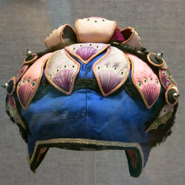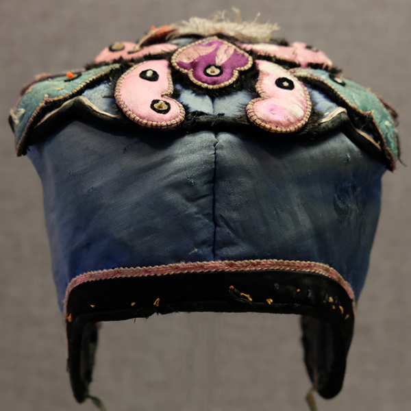 妇女儿童博物馆:蓝缎地贴补堆锦鱼戏莲纹棉帽