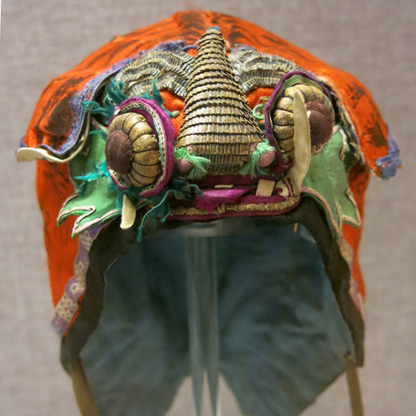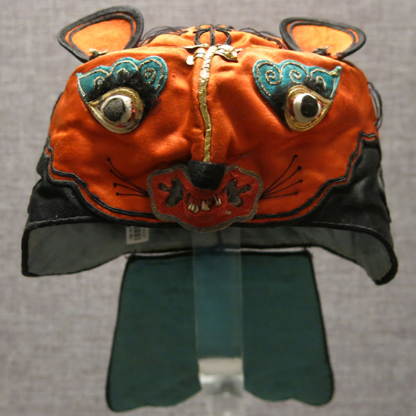 妇女儿童博物馆:桔红缎地贴补墨绘虎头帽