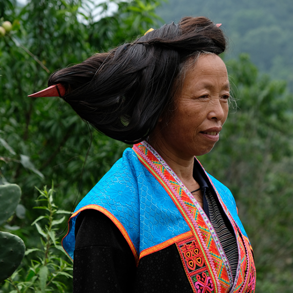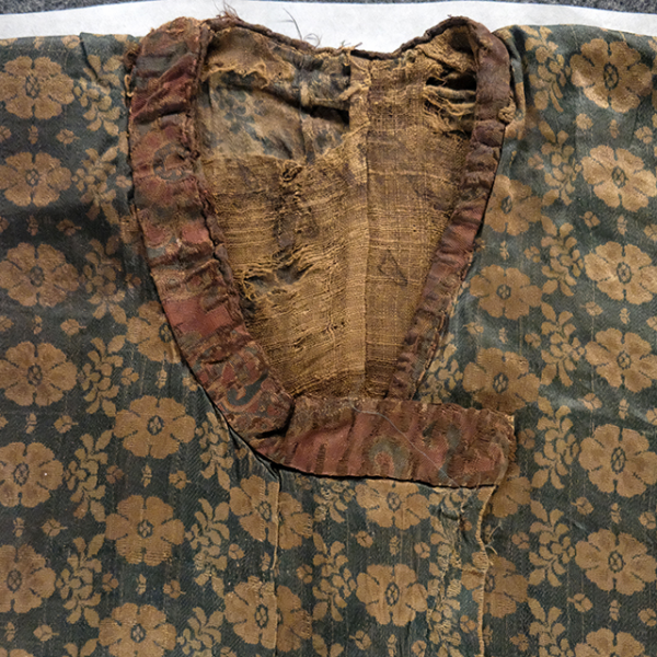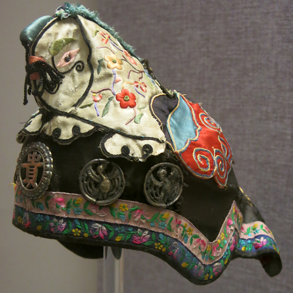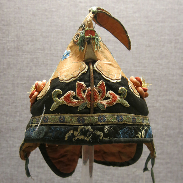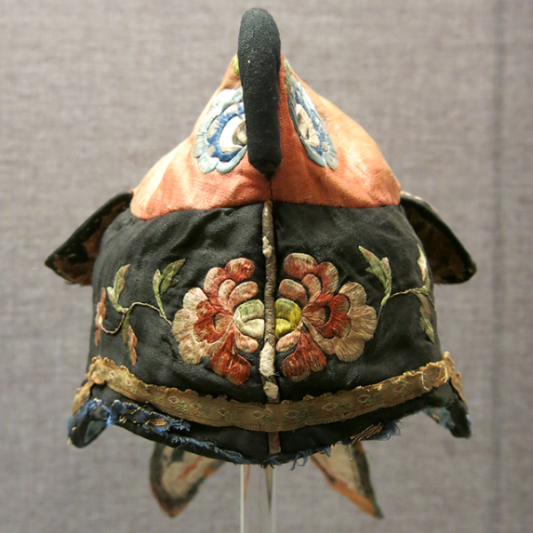 黑缎地布贴蝶翅顶平绣花卉纹鹰首风帽