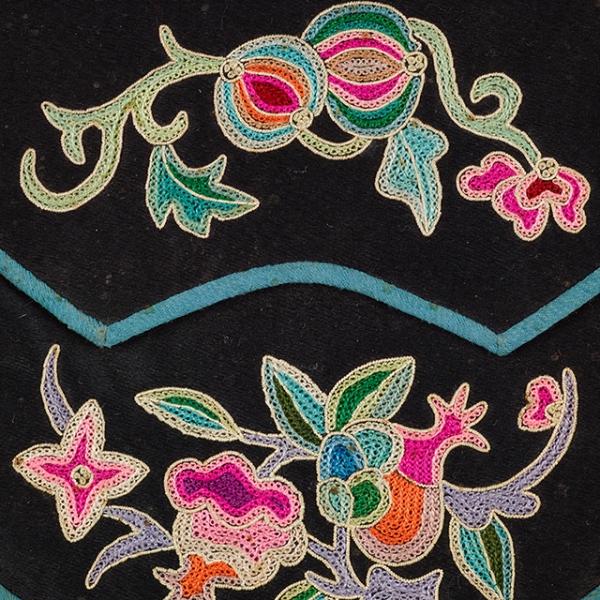 妇女儿童博物馆:黑缎地布贴绣花卉蝙蝠纹夹帽