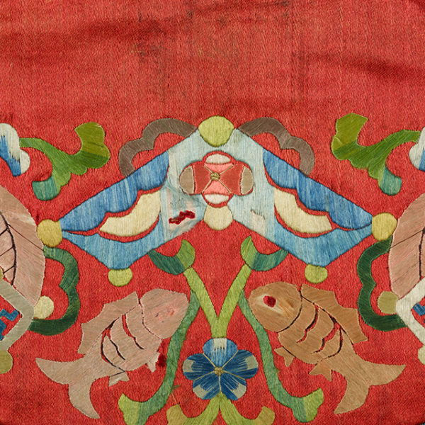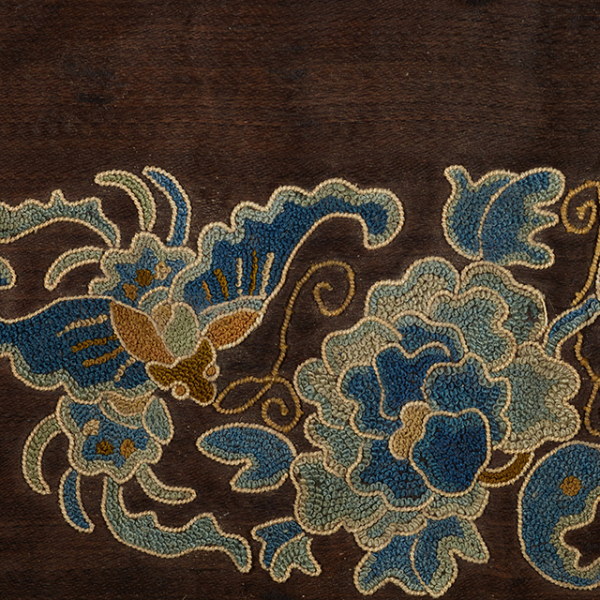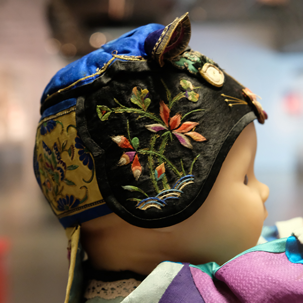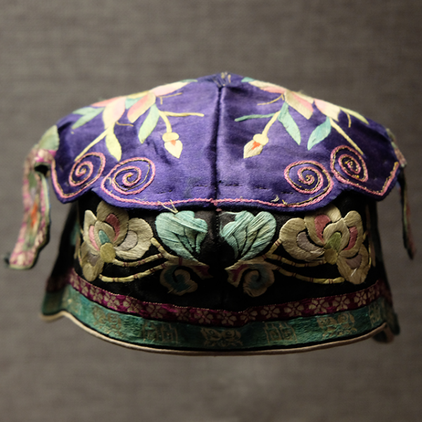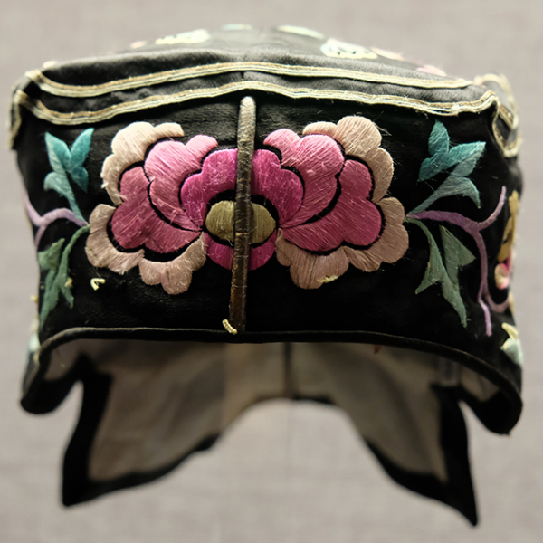 妇女儿童博物馆:黑缎地平绣莲花牡丹纹连尾夹帽