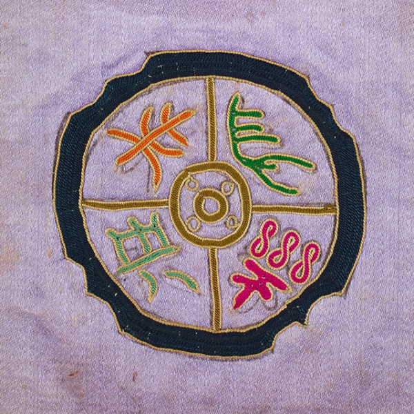 提花粉缎平绣花卉纹贴补太极图缀银人夹帽