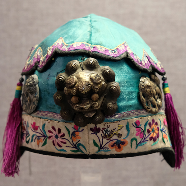 绿缎地镶平绣花鸟纹额边缀银三狮夹帽