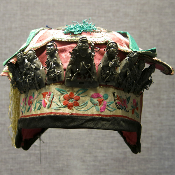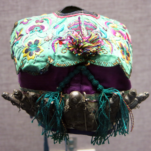 紫地镶绿缎顶平绣花鸟纹缀银八仙庆寿夹帽