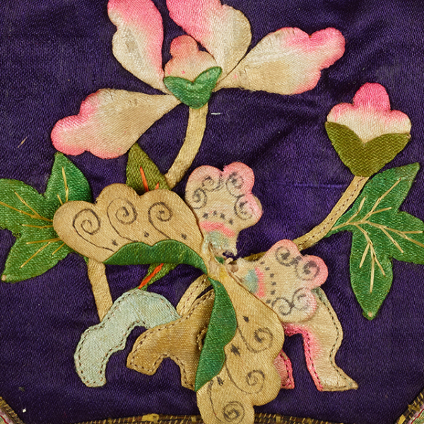 黑缎地彩缎布贴蝠纹平绣花卉石榴纹夹帽
