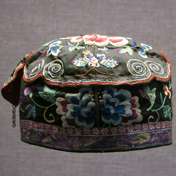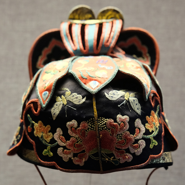 妇女儿童博物馆:黑缎地打籽平绣花蝶纹莲顶帽