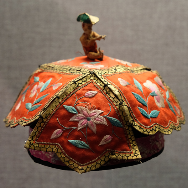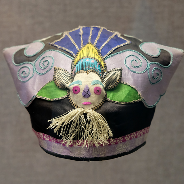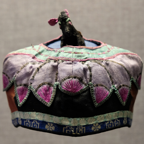 妇女儿童博物馆:彩缎拼接驴背葫芦荷花顶夹帽