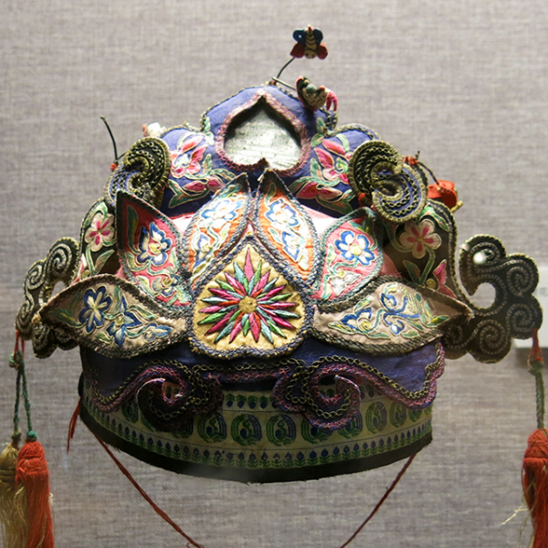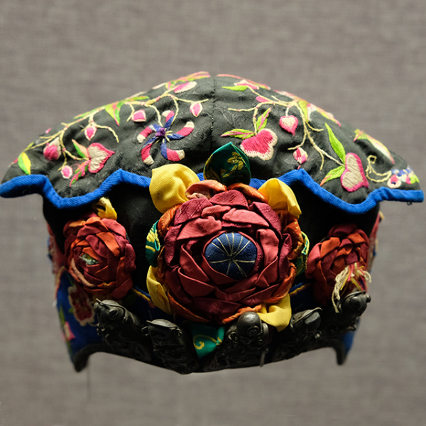 妇女儿童博物馆:彩缎拼接莲花冠过桥戏装帽