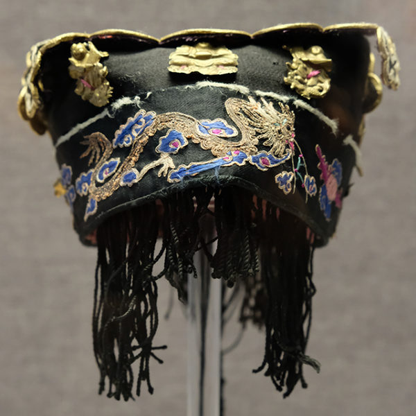 黑缎地钉线绣云龙纹平绣孔雀牡丹纹黑辫夹帽