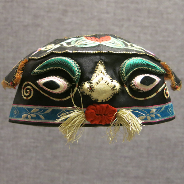 妇女儿童博物馆:黑缎地布贴平绣瓜纹狮子帽